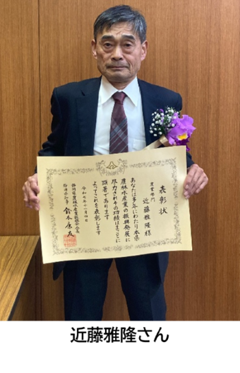 農業部門では、広見地区近藤雅隆さんが受賞しました。近藤さんは、経営面で低コスト化や自給飼料の有効活用に積極的に取り組むほか、静岡県青年農業士会会長や富士宮市農業委員を歴任し、地域農業の発展に多大な貢献をされました。こうした功績が認められ、今回の受賞となりました。